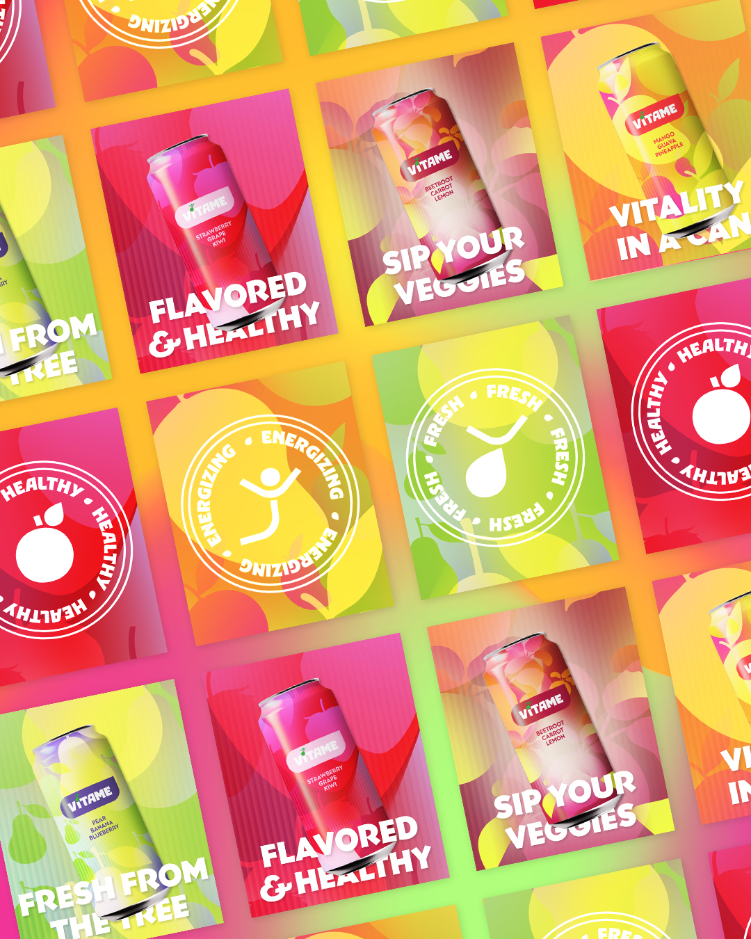 Vitame est une marque de jus de fruits pensée autour de valeurs essentielles : le sain, la fraîcheur et l’énergie. Son identité visuelle a été conçue pour traduire immédiatement ces promesses, tout en s’inscrivant dans une stratégie de différenciation forte et durable sur un marché très concurrentiel.